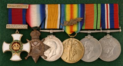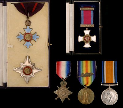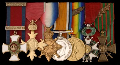 Group of seven Court Style mounted. D.S.O. George V Gazetted 14-01-1916. 1914/15 Star Trio. Captain F.J. Chapple RGA. Major on pair with M.I.D. Gazetted twice 01-01-1916 and 23-12-1918. French Legion of Honour (Croix de Chevalier), French Croix de Guerre with Oak Leaves, O.B.E. 2nd type Gazetted 24-06-1946 (Bristol Wing Committee. Air Training Corp). All of the medals and awards are confirmed by copy paperwork and research. Medals are all VF.