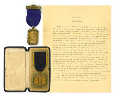 (a) Edward Medal (Industry) 2nd Rev type with Coinage Head in bronze. Named to George Tolson (boxed). (b)Imperial Chemical Industries Bravery Award (Medals Yearbook L37A). Named to George Tolson 26-07-1930, 9ct gold (boxed).(c) Carnegie Hero fund scroll dated 26-07-1930. (d) Original typed Citation describing the incident is included along with invitations to the Palace and various other related documents. ""The incident was at I.C.I. Chemicals Billingham and involved an attempt to rescue a man after the explosion of acid tanks. George Tolson was in charge of the Works Fire Team. He was exposed to the acid and fumes for 5 minutes and was severely burned.""