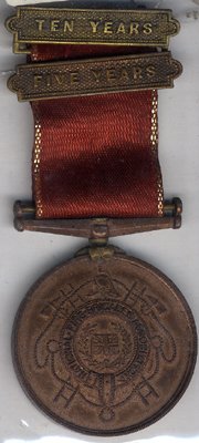 National Fire Brigades Union Medal in bronze (286AB) in Medal Year Book, to 7788 Alfred King on the edge, with extra 5 + 10 year service clasps (ribbon is incorrect ???? item), GVF.