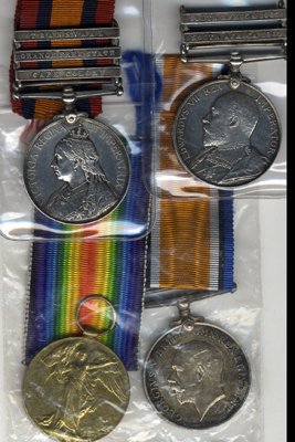 Group of four - QSA Queens South Africa Clasps Cape Colony, Orange Free State & Transvaal 771 Sapper W Padmore, Monmth Rl Engrs (scarce unit), 1914 Star Trio 13154 Pte W Padmore S Wales Bord (MIC copy card) with silver wound badge. QSA VF with very minor EK's, Trio GVF (un-researched group fresh to the market).