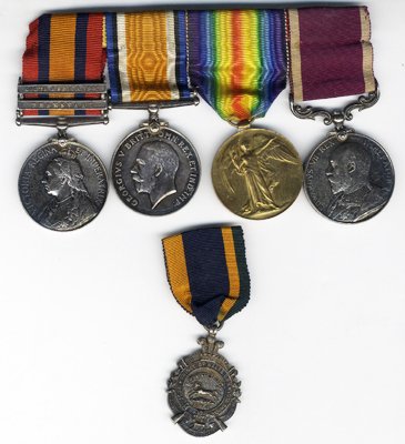 Group of four mounted as worn plus Regimental Medal, QSA Clasps, Transvaal, South Africa 1902 3268 Sgt W Fuguel, W Yorks Regt. BWM & Victory 20807 WO Cls 2 W Fuguel, York Regt & Edward VII LSGC 3268 C Sgt W Fuguel, W Yorks Regt. Regimental Medal in silver H/M 1907 with black & yellow striped ribbon, obverse 'Prince of Wales Own West Yorks Regt' depicting a horse & other legends i.e. '14th Regt depot', '3rd Vol Battn', '2nd Battn Bradford', '3rd Battn Leeds' & '1st Battn Yorks'. Reverse inscribed CR Segt W Fuguel P S 3rd West Yorks Regt 1907 & hallmarked for 1907. Un-researched, fresh from the family & new to the market. Toned, GVF.
