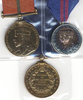 Group of three - Queen Victoria Diamond Jubilee 1897 (bronze) to P C L Davies, K Division (EF), King Edward VII Coronation 1902 (bronze) to P C L Davies, K Division (GEF) & King Geo V Coronation 1911 (silver) to P S L Davies (GEF). Also commemorative bronze medallion - obverse 'Our Empire Prince' 24 May 1927, reverse 'For God, King & Empire'. Head of Edward VIII as Prince, reverse Sun burst beneath bridge over sailing ship (GVF).