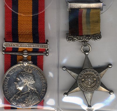 Pair - QSA Clasp Defence of Kimberley, Kimberley Mayors Siege Medal 1900 hallmarked 'a' (VF). QSA named Pte J Sandilands Kimberley Town Gd (really nice EF).