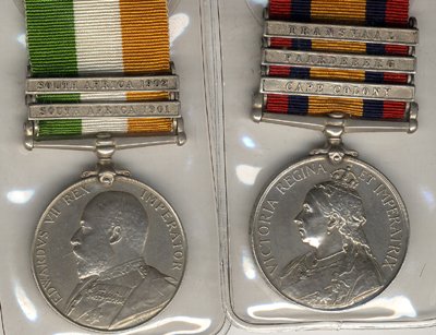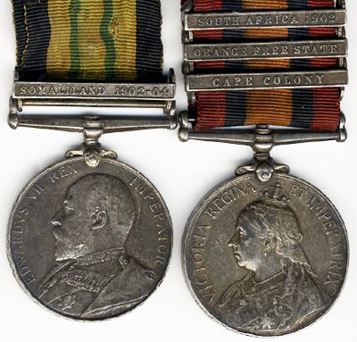 QSA 3 Clasps, CC, OFS, SA 1902 (loose on ribbon) 6988 Pte J Stewart DLI. Edward VII AGS Clasp Somaliland 1902-04, J G Stewart Sto 2 Cl HMS Hyacinth. Believed to be the same recipient (un-researched), heavily tarnished with minor EK's & clash marks, Near VF.