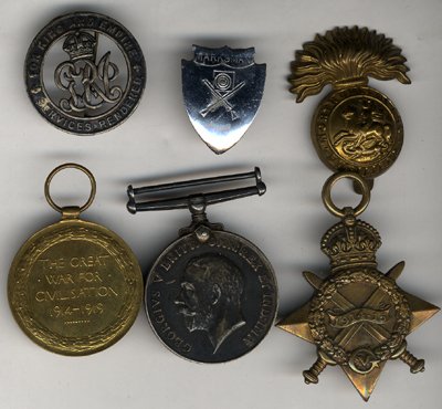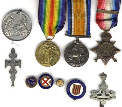 Trio - 1914 Star, BWM & Victory + Bar & rosette. 1914 Star named to 7872 Pte J Lees 2/Seaforth Highlanders, BWM & Victory to 46399 Pte J Lees York Rgt. Lot includes Mary Xmas tin, Sunday School Medal, York Rgt badge, M S Devonia enamel badge, Northumberland Special Constabulary button hole badge, Hornby Railway Company badge & registered letter envelope possibly addressed to Bridlington, Yorks, NEF.