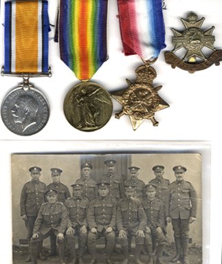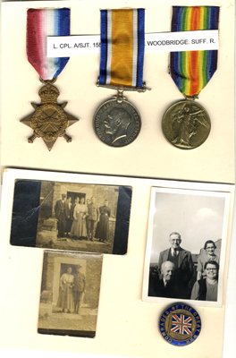 Trio - 1914-15 Star, BWM & Victory, 15552 L Cpl J T K Woodbridge, Suffolk Rgt plus three photos & Comrades of the Great War enamel badge, VF.