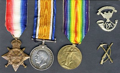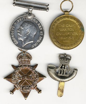 Trio - 1914-15 Star, BWM & Victory, 17087 Pte S Perry, Som L Inf, also includes Rgt badge, VF.