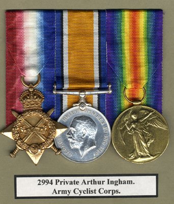 Trio - 1914-15 Star, BWM & Victory, 2994 Pte A Ingham, Army Cyclist Corp, entitled to silver wound badge, B-262439 photo & hospital group photo, GVF.