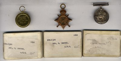 Trio - 1914-15 Star, BWM & Victory, RTS-6320 Pte F Brough ASC, in box of issue, NEF.
