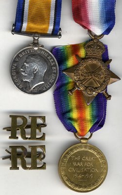 Trio - 1914-15 Star, BWM & Victory, 123842 Pnr J E Farrell RE, with copy documents showing he was discharged due to bad teeth, he had one left, VF.