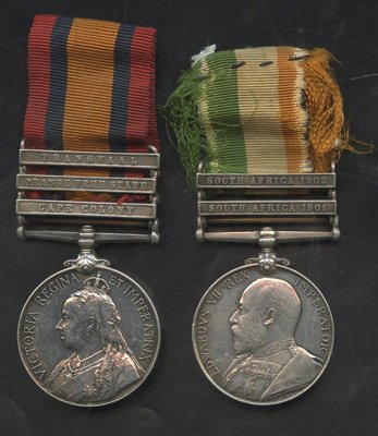 Pair - QSA clasps, cape colony OFS & Transvaal 2664 Pte S Dodd, KSA clasps SA 1901 & 1902 to; 2664 Pte S Dodds, North'd Fus, note Dodd on QSA he is listed as Dodds & POW 10.12.1899 at Stromberg serving in 2nd Battn. North'd Fus. Contained in Queen Victoria South Africa 1900 Baccy tin. GVF.