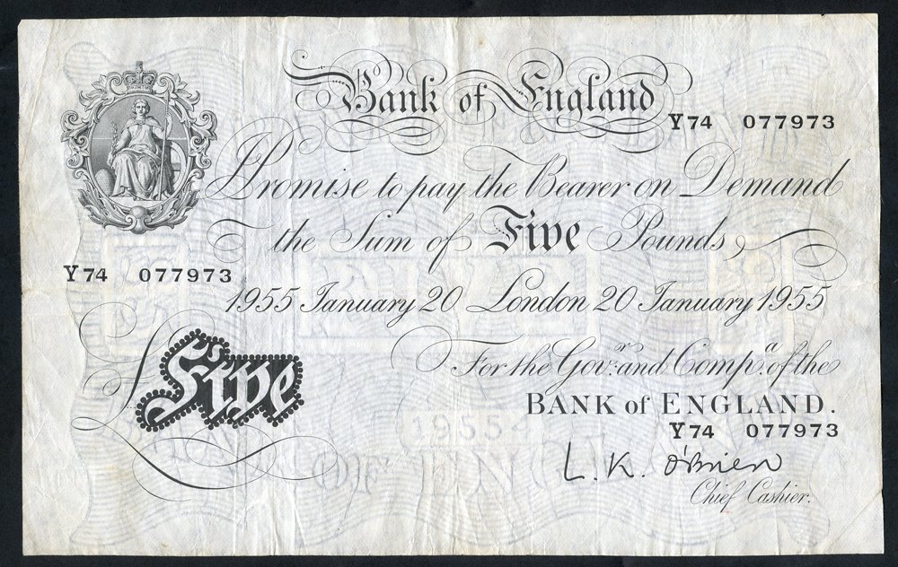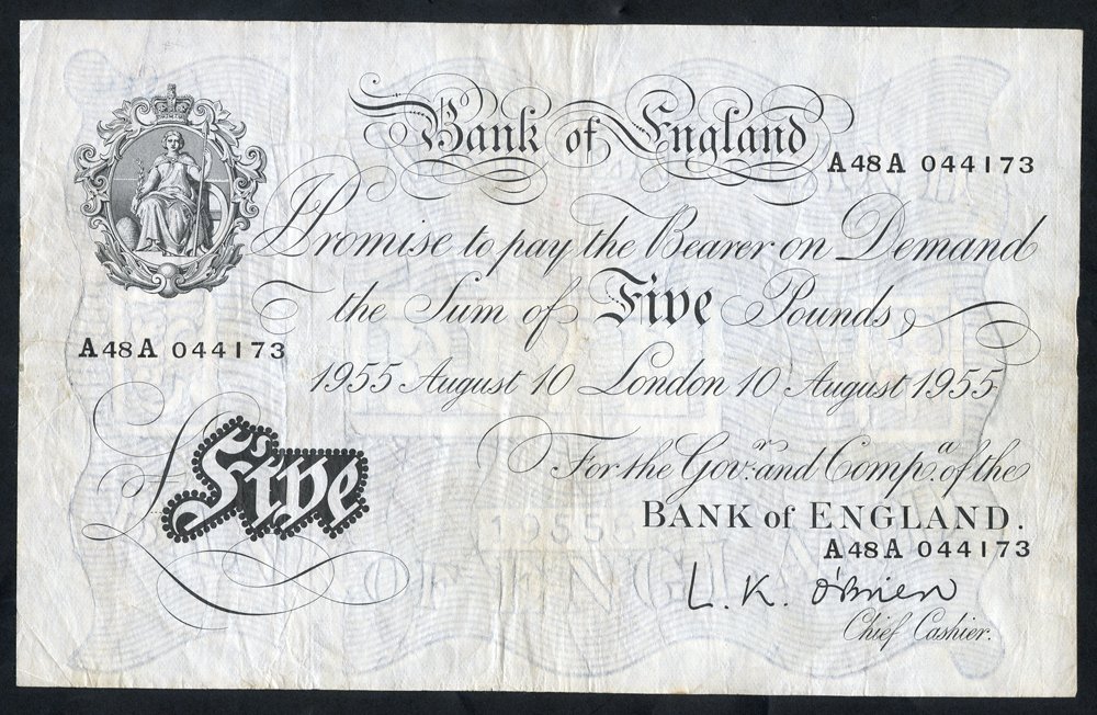 O'Brien £5 White, B275, dated 26th March 1955, series Z31 008029, Pick 345, fine+ (1)