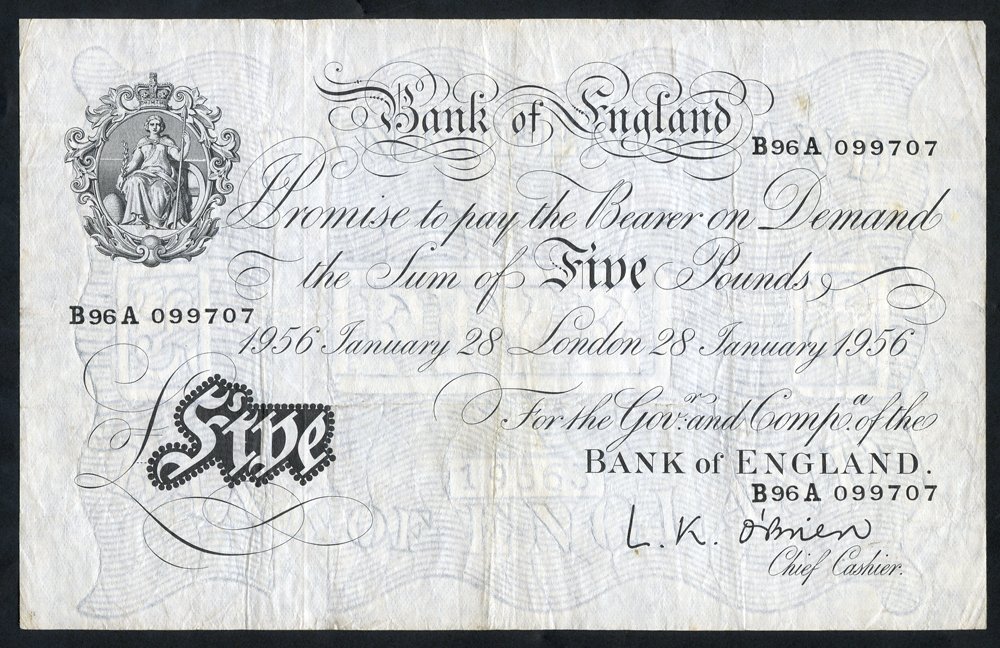 O'Brien £5 White, B276, dated 28th January 1956, series B96A 099707, Pick 345, fine+ (1)