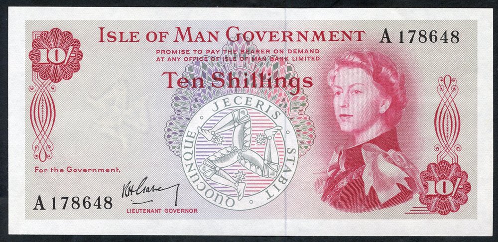Isle of Man 10 shillings, issued 1961, series A178648, Garvey signature, Pick 24a, about UNC to UNC. (1)