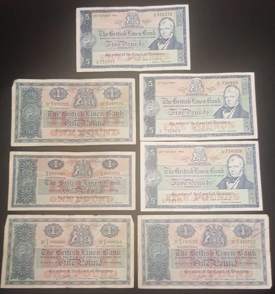 British Linen Bank £1 (4) and £5 (3), dates range from 1944 to 1964, fine or better. (7)