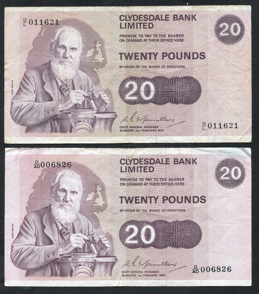 Clydesdale Bank Ltd £20 (2), dated 1976, series D/L 011621 & dated 1980, series D/AD 006826, Pick 208b, fine & good fine. (2)
