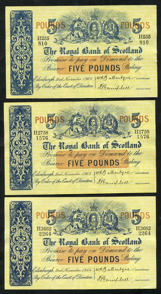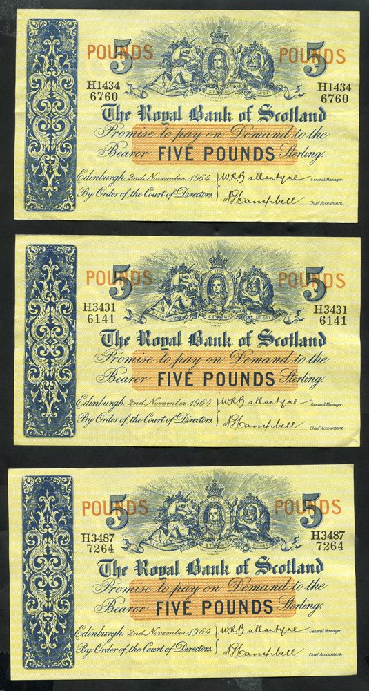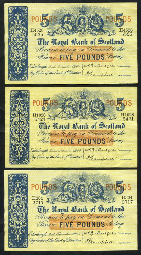 Royal Bank of Scotland £5 (3), dated 1964, series H, Pick 326a, GVF to EF. (3)