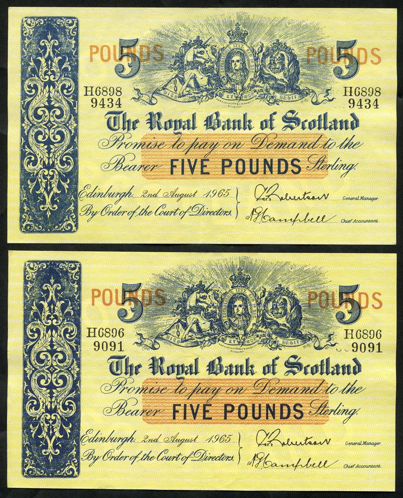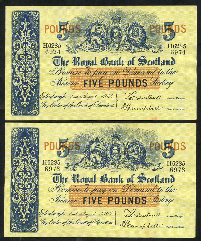 Royal Bank of Scotland £5 (2), dated 1965, series H, Pick 326b, EF. (2)