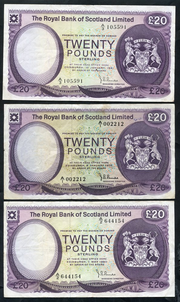 Royal Bank of Scotland £20 (3), dated 1972, series A/1 002212 (small inked number), 1980 series A/2 & 1981 series A/3 (small pin holes), Pick 339, good fine to VF. (3)