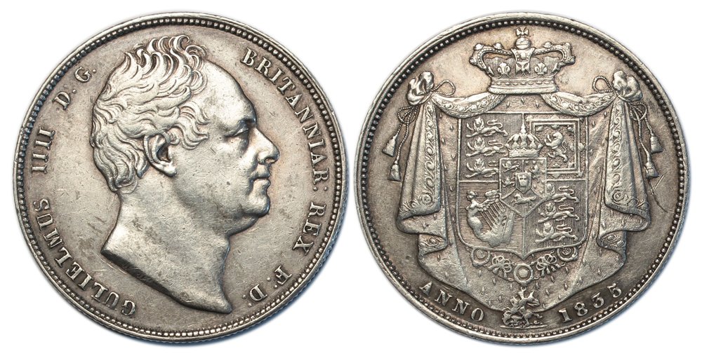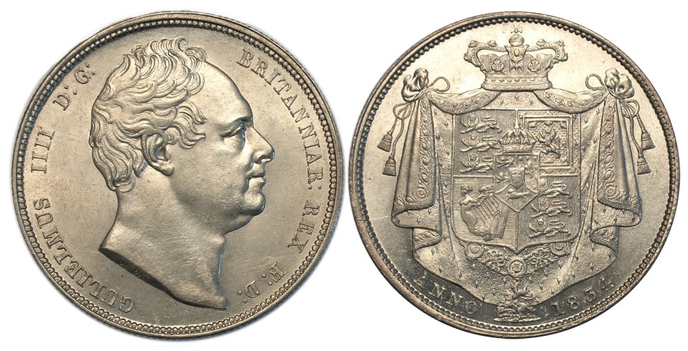 1834 halfcrown, WW Script, choice UNC with just a very light tone over full mint bloom. A very pleasing & exceptionally nice example. S3834.