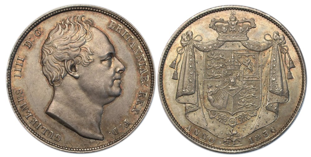 1836 halfcrown, proof-like UNC, toned, the obverse toning a little patchy. S3834.