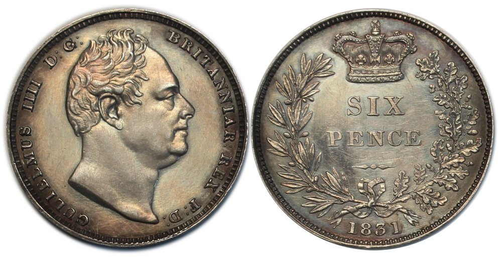 1831 proof sixpence, plain edge, from the proof sets of the year. Die axis rev. inverted, A/FDC toned, very rare. S3836.