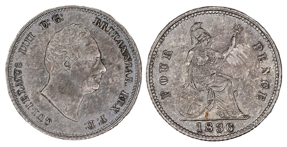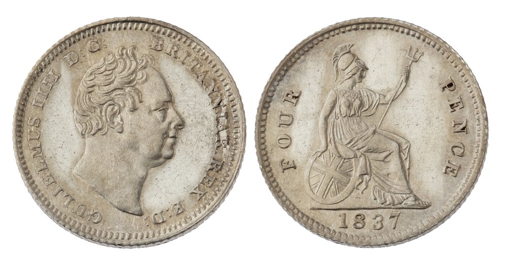 1837 groat, Britannia reverse, Type 2 obverse, UNC & quite prooflike. S3837.