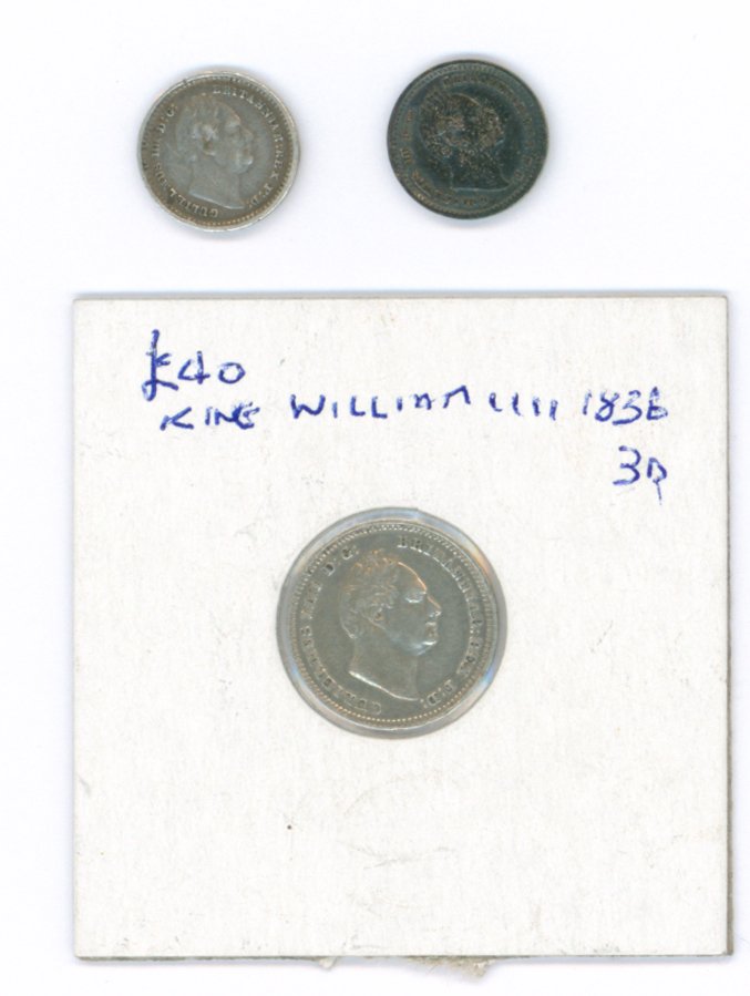 1836 threepence, VF, 1834 three halfpence, AEF plus another, 1835 AVF. (3)