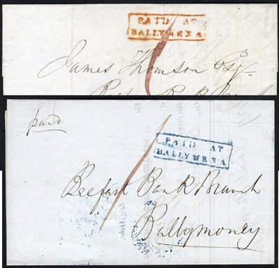 1840 & 1845 entires to Ballymoney showing '1' m/s & boxed Paid At Ballymena type 28 in blue & red respectively, 1861 crowned 'Free' embossed decorative envelope franked 1d red used Dublin to Thomastown 1871 & 1870 embossed illustrated envelopes of the Farmers Gazette used Dublin to Kilmancow franked 1d reds. Odd minor imperfections but scarce group. (5)