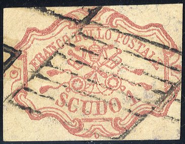 PAPAL STATES 1852 Pontifical Arms 1 scudo carmine rose, complete margins, posthumously cancelled with black grill, Sassone II Sergio Sismondo cert. accompanies. (1)