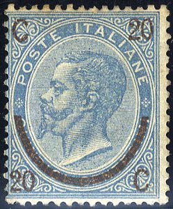 1865 20c on 15c dull blue Pl. III M, faint toning at top, signed by Diena, SG. 19. Cat. £1400