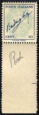 1944 Regency unissued 50c 'Badoglio' azzuro & celeste bottom marginal UM (single pulled perf. lower right) without watermark. Rare, Sass 515F. Cat. €2800