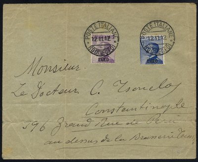 1927 envelope to Constantinople from Rome franked L1.25 Volte + pair 60c airs, tied by c.d.s. On reverse Stambul transit & Galala arrival c.d.s. Also Aeroespresso Italiano 1933 airmail etiquette sheet of 20 + section dealing with timetable & rates.