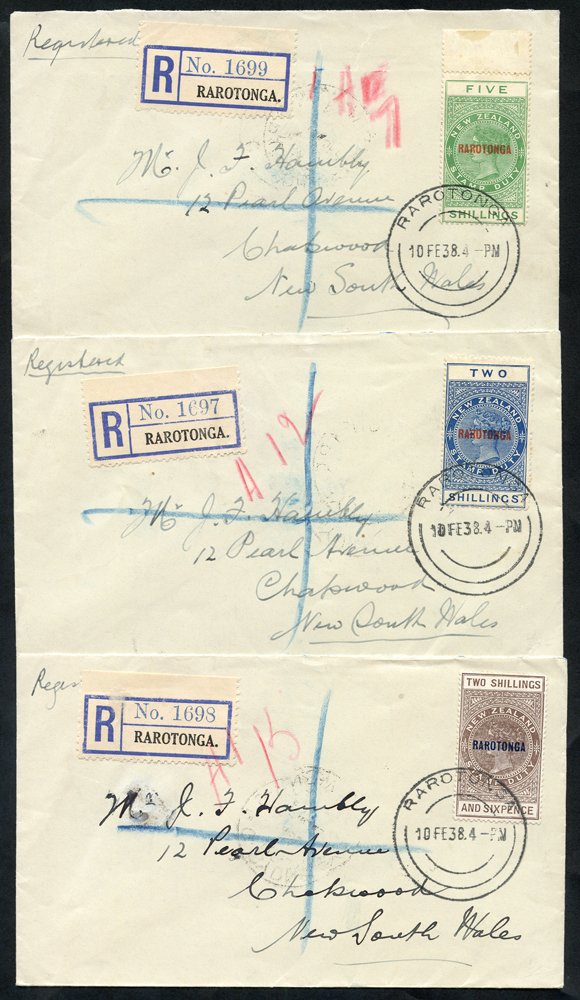 1938 trio of reg covers with 1921-23 NZ postal fiscal vals 2s, 2/6d & 5s o/p Rarotonga with reg. labels used to NSW, SG.76, 77, 78. (3)
