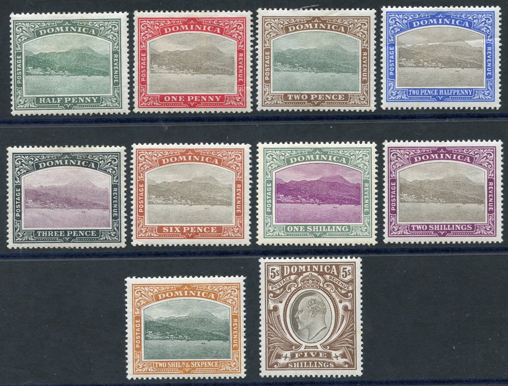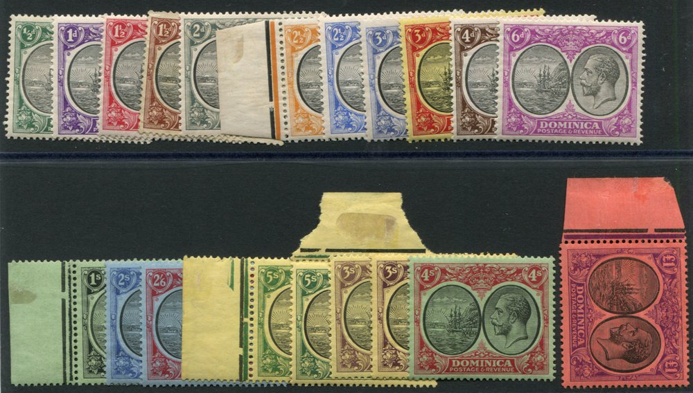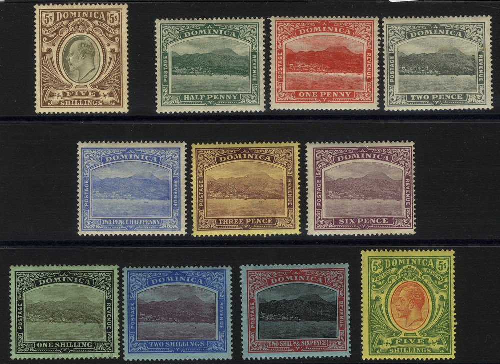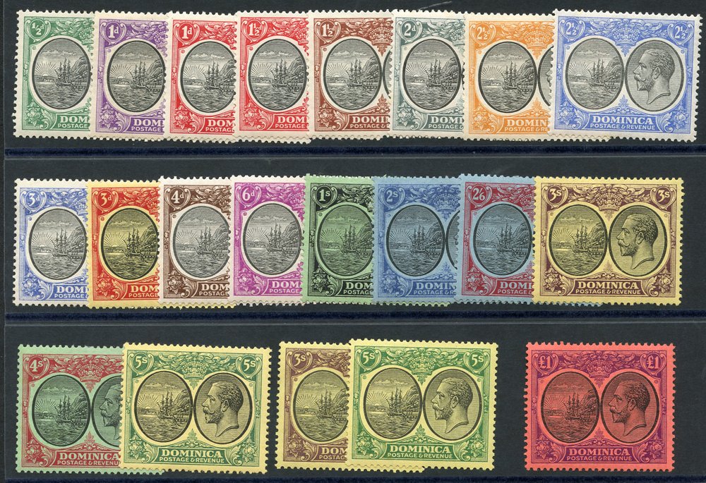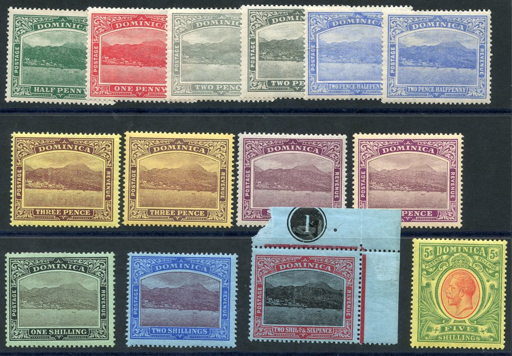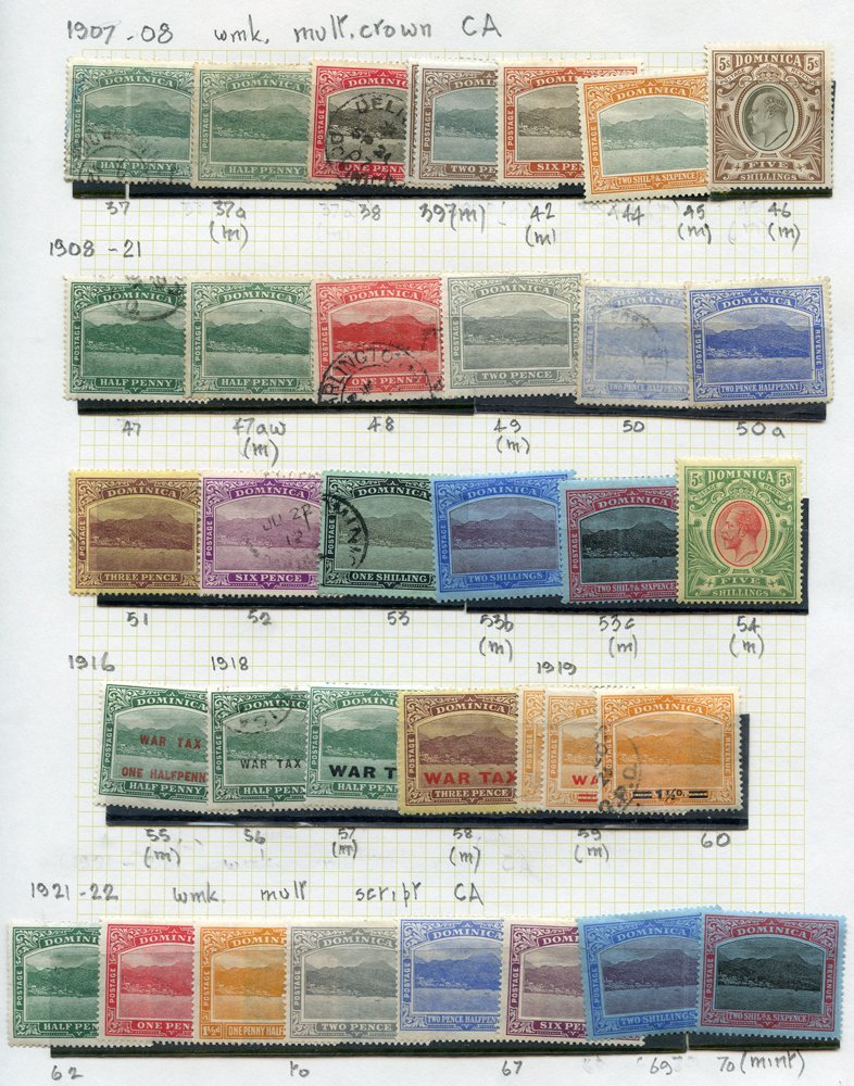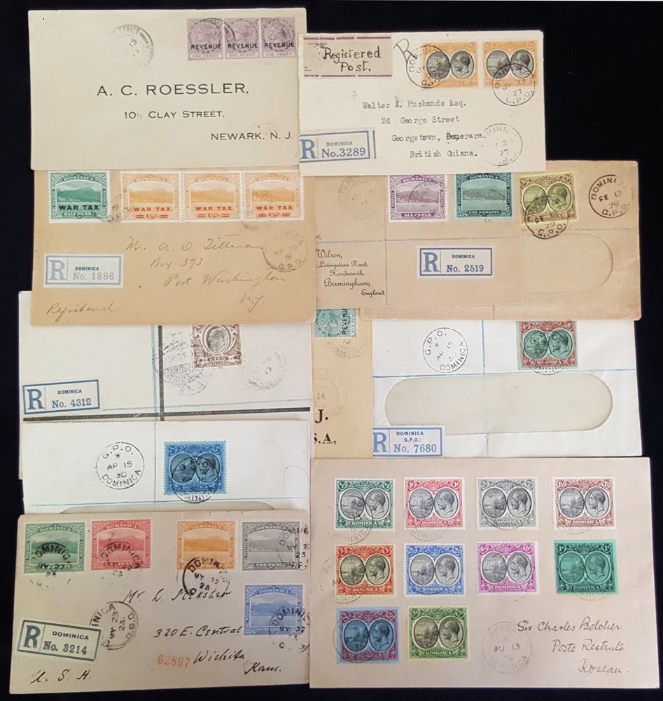1884-1936 selection of covers incl. 1913 reg cover to Germany, franked KEVII 5s value, 1919 reg cover to USA, franked War Tax ½d, strip of War Tax 1½d (centre stamp with short fraction bar), 1923 reg cover to USA with five colour franking ½d to 2½d Roseau. Good mix of KGV frankings on reg covers with mixed & single frankings incl. 2s, 3s & 4s vals, another cover bears (10 vals) from ½ to 5s used locally, 1912 reg cover to USA, franked QV 6d green optd REVENUE, tied Dominica double ring c.d.s. etc. Attractive lot. (22)
