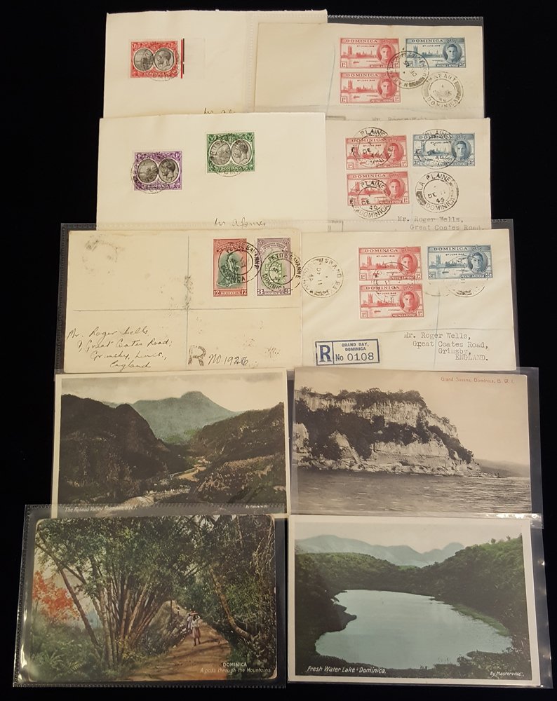 1930-40's pair of covers Roseau to London with KGV ½d + 1d or 1½d, tied Roseau/Dominica c.d.s. Four reg. 'ROGER WELLS' covers franked 5½d Victory vals, pmks - Grand Bay, La Paline, Mahaut, also 1951 University Coll. pair postmarked Petite Savanne, plus four unused PPCs of island views. (10 items)