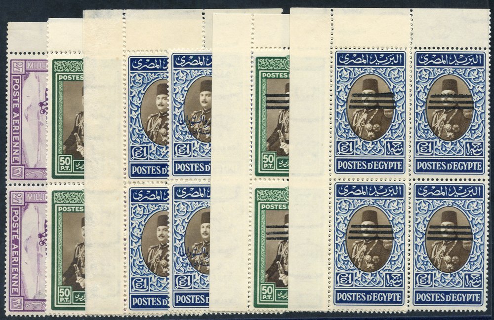 1926-29 27m Air, SG.132, 1939-46 50p & £E1, SG.282/3, 1952 £E1 optd, SG.391, 1953 50p & £E1, SG.453/4, each being a UM block of four (Air block 2x UM), 5 of the 6 blocks are marginal or corner marginals. (24) Cat. £542