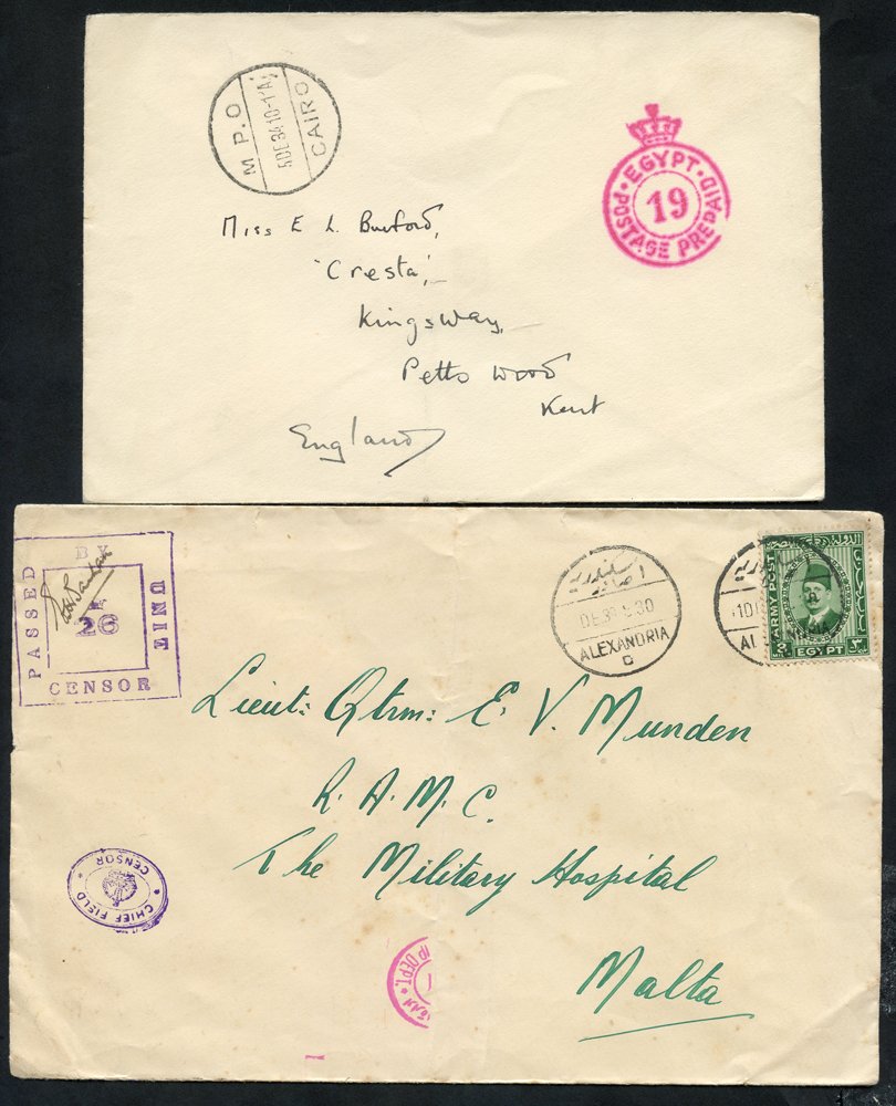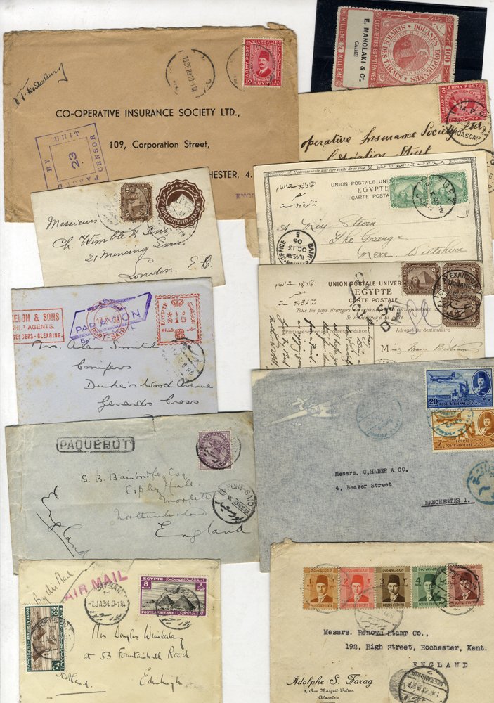 Early 20thC - later range of covers, PPC's, postal stationery, banknotes incl. 1943 £1, ship cards & paquebots with underpaid and T.P.O noticed, Sphinx & Pyramids covers, cards, censored, airmail, 1930's British Army post vals with 10 mills & 3 mills green cover, various dated Fuad & Farouk covers, some later. (10)