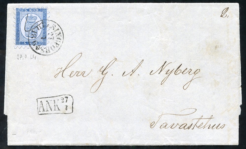 1864 cover to Tavastehus franked 5 Kopek blue Mi. 3A tied fine Helsingfors single ring date stamp for 27/7/1864& m/sheet mark, below boxed AVK mark, fine entire letter.