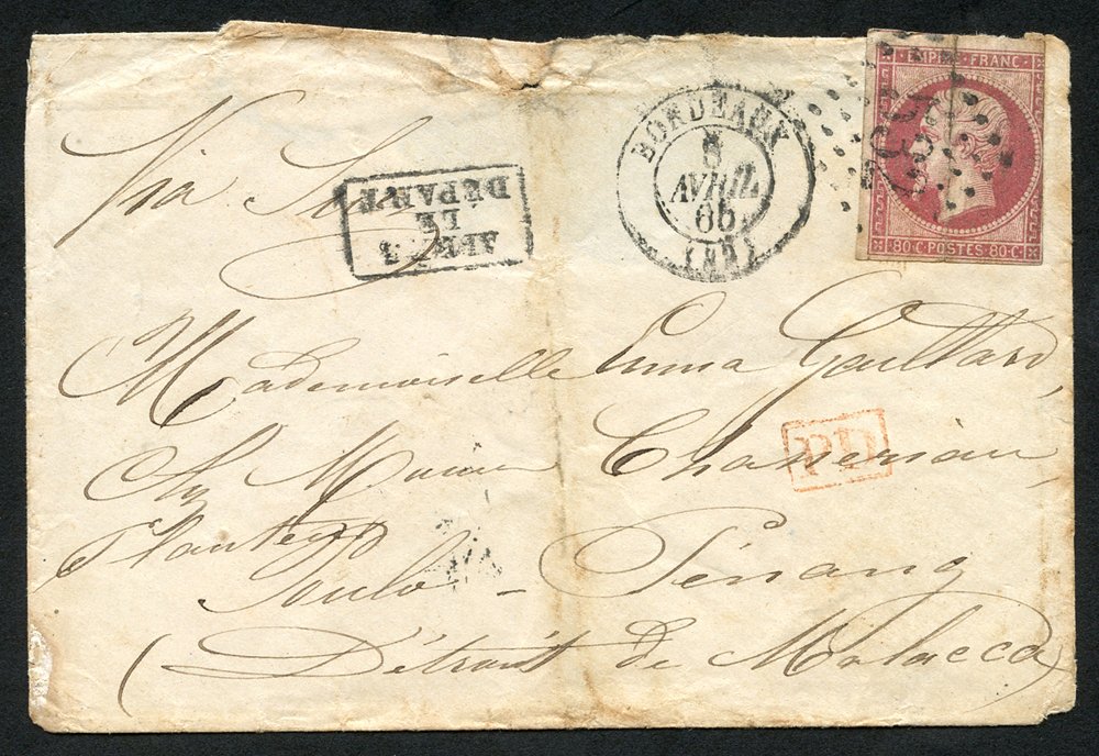 1865 env addressed to Poulo - Penang, Malacca bearing French Napoleon 80c rose (Yv17b), tied '532' in dotted lozenge with adjacent Bordeaux d/stamp, boxed 'PD' in red & boxed instructional 'Apres le Depart' endorsed 'via Suez.' Some faults, nevertheless a remarkable French destination item & the first recorded to Penang.