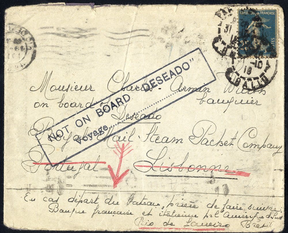 1918 env franked 25c 'Sower' cancelled Paris, to a banker on board a ship due at Lisbon, bears large cachet 'NOT ON BOARD DESEADO' & annotation 'Has left ship. Write to French & Italian Bank of South America in Rio de Janeiro'.