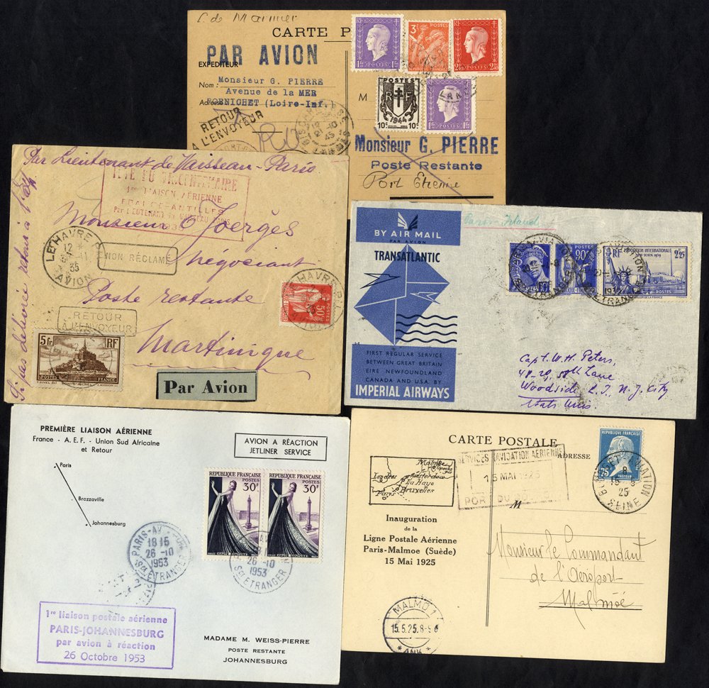 1925-53 first flight covers (5) 1925 Chailloux flight Paris - Malmo special card, 1935 Bonnot Bordeaux - Martinique with cachet cover also flown Le Havre - Bordeaux, 1945 Lionel De Marmier flight Biscarosse - Port Etienne, Mauritania, 1939 Acceptance for Imperial Airways Southampton - New York, scarce official cover, 1953 UAT Comet Paris - Johannesburg with cachet.