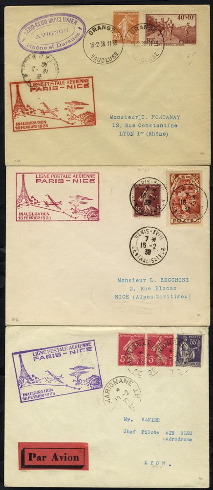 1938 first flight covers (4) comprising Air France/Air Bleu Paris/Nice with cachet, another on a commercial cover, one Marseille/Lyon & another Orange/Lyon. (4)
