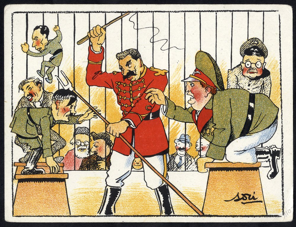 WWII propaganda card depicting Stalin as lion tamer, taming Hitler & other Nazi leaders.