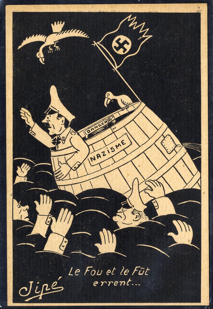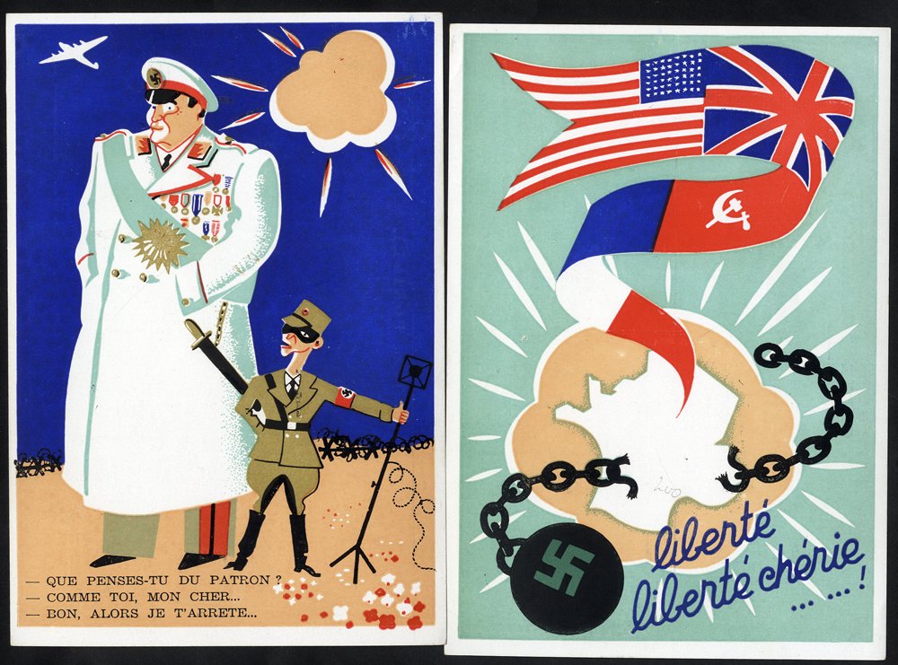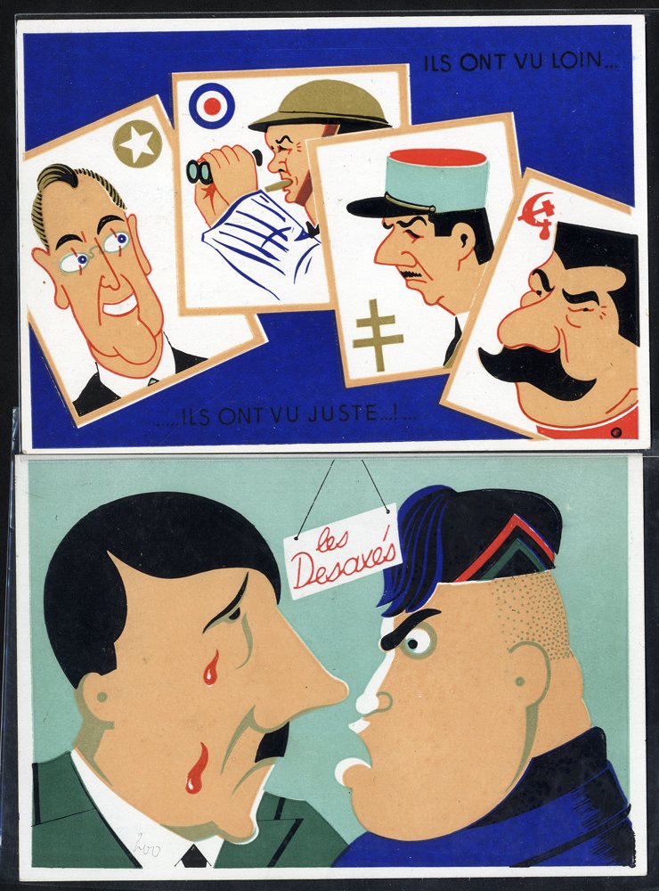 WWII PROPAGANDA CARDS (2) by Lenoir of Cannes entitled 'Les Desaxes' and the other depicting the four Allied leaders. Scarce.