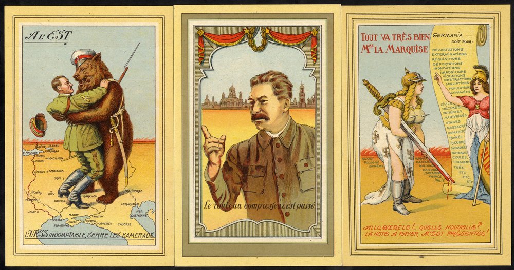 WWII PROPAGANDA CARDS (6) pressing for War against Hitler incl. Hitler being squeezed by Russian Bear, cards with Stalin and Roosevelt. Nice condition.