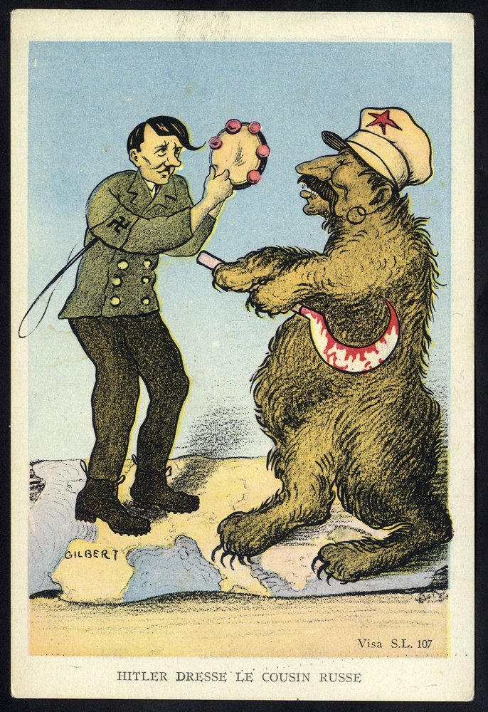 WWII propaganda card in colour entitled Hitler Dresse Le Cousin Russe. Unused & rare.
