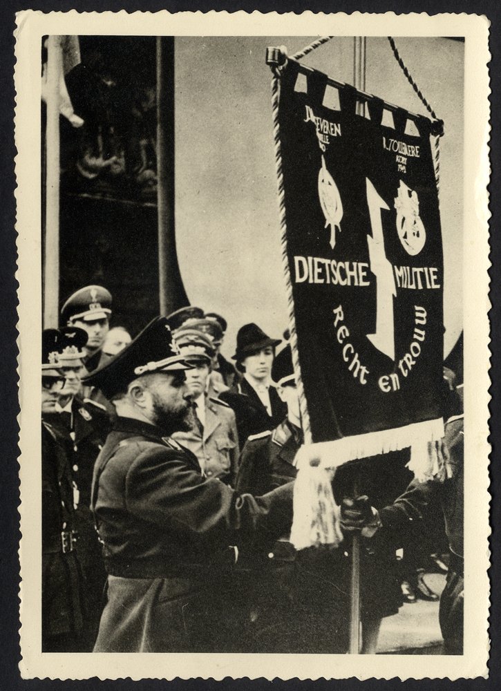 WWII photographic card depicting Belgian Nazi sympathisers with banner flag. Unused & scarce.