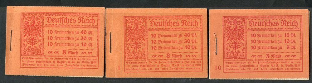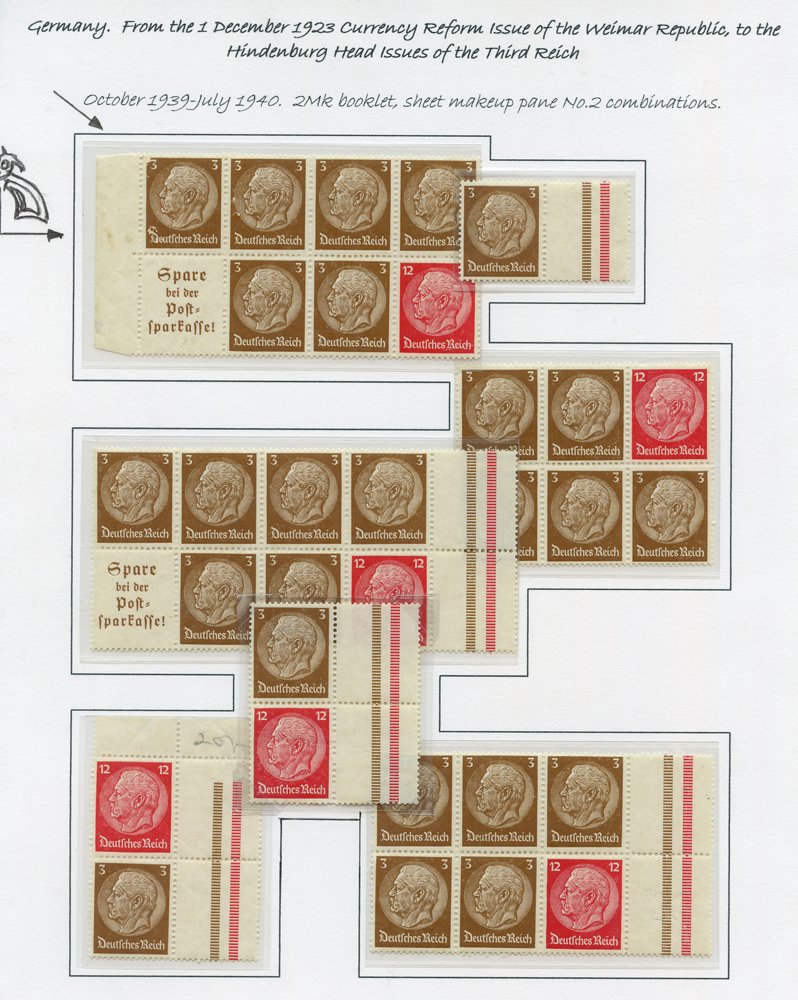 1958 President Heuss/Numeral booklet stamps - the 1dm booklet (Mi.MH4xv) complete + an exceptional range of combinations from sheets from which booklet panes were taken. There are many scarce & highly catalogued examples with pairs, strips, wmk variations, 36 UM, 26 FU. (1 bklt, 62 combinations). Total Cat. 3232€