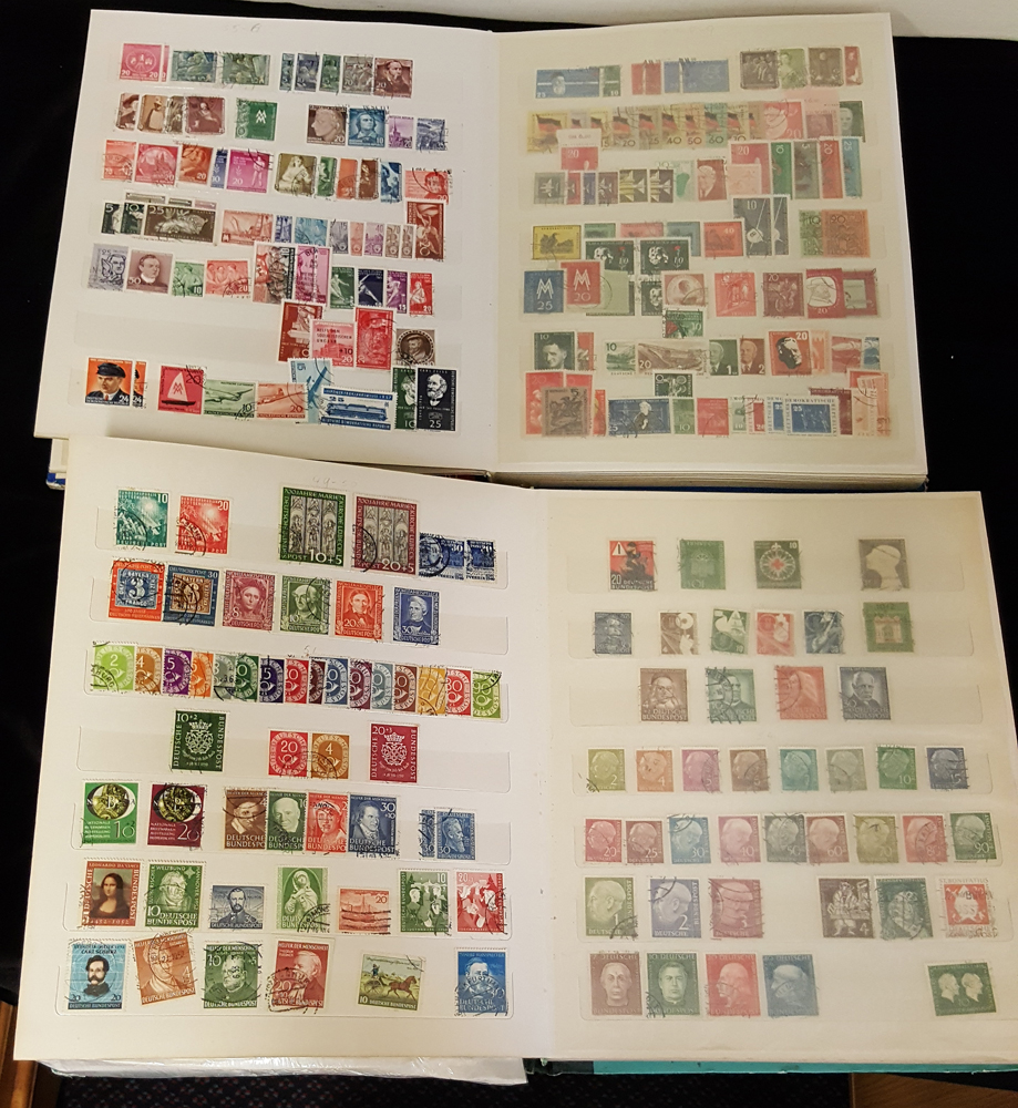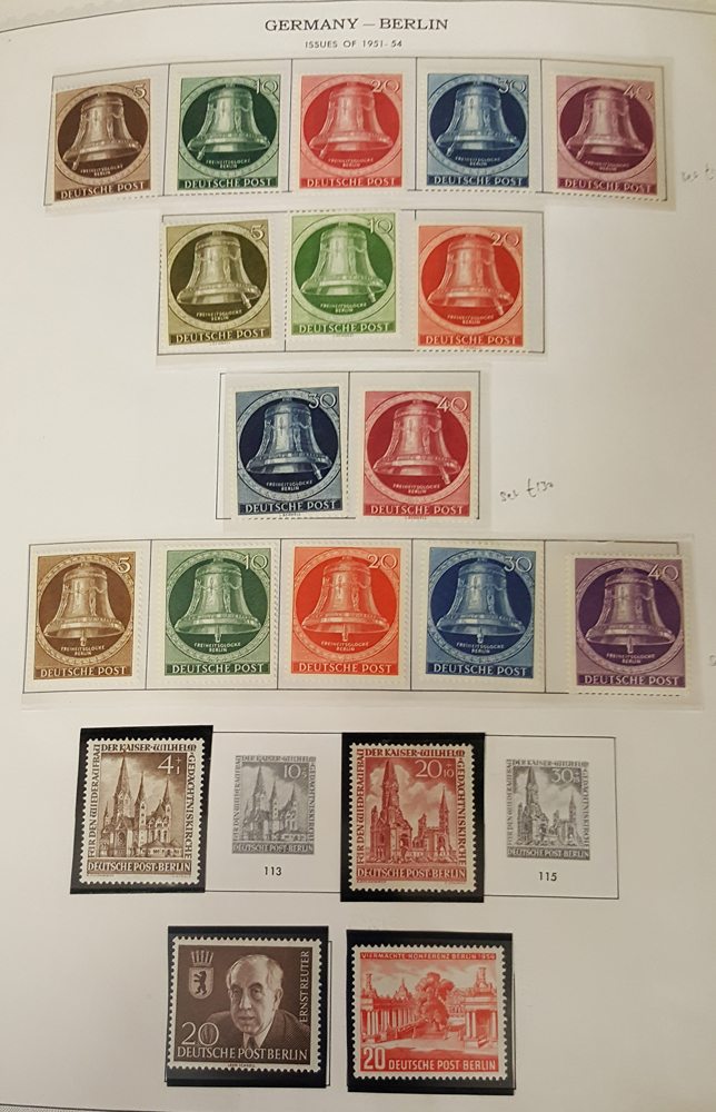 1948-90 substantial collection of M & U housed in a peg fit album; general run through incl. several better complete sets incl. Berlin 1948-90 with 1949 Goethe 30pf M, 1949 Surcharge set FU, 1950 Philharmonic set FU, 1951 Stamp Day set FU, 1951-53 all three 'Bell' sets M 1950 Uprising set FU etc. West Germany 1949-88 with 1949 UPU FU, 1949 Relief Fund FU set, 1950 Posthorn set FU, 1950 St Mary's Church set FU, 1951 Charity set FU, 1951 Wuppertal Exhibition set FU, 1953 Charity set FU, East Germany 1950-70 with 1950 Bach set FU, 1950 Academy of Science set M, 1950 Labour Day M, 1950 Debria M, 1951 Leipzig Spring Fair set FU, 1951 Visit of Polish Pres set FU, 1951 China Friendship set M, 1951 Students Festival set M, 1953 Karl Marx M/Sheet (2) Imperf M, 1953 Five Year Plan set M another set FU etc. Very high catalogue value.